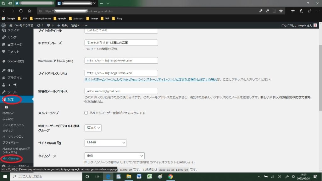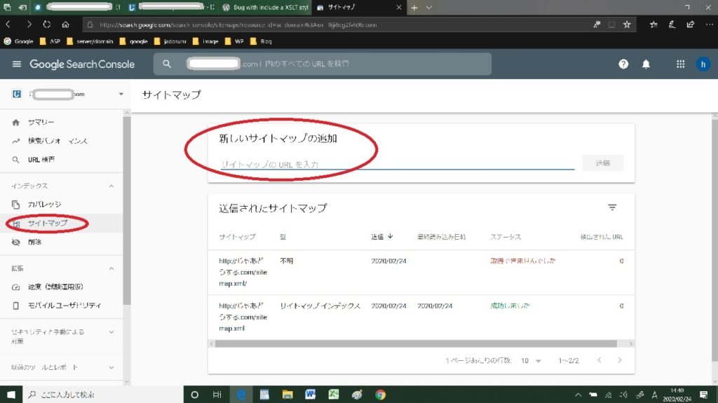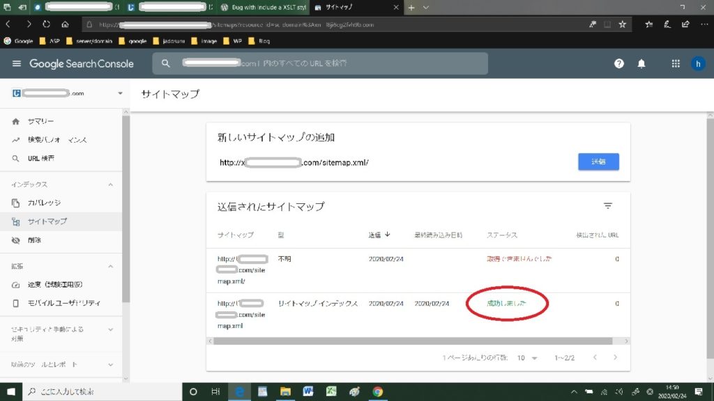 <新しいサイトマップの追加>に入力するURLは、ワードプレス<設定>→<XML-Sitemap>の画面の<〇〇に開始されたpingの結果>にある、<あなたのサイトマップのインデックスファイルのURL: >以下のURLです。これをコピーして貼り付ければOK。